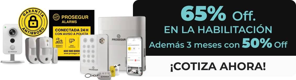 Oferta válida para personas naturales o jurídicas, clientes nuevos o para servicios en un inmueble distinto al actual de clientes vigentes de Prosegur Alarms, que contraten hasta el 31 de Diciembre del 2025 inclusive, contratando el PACK PLUS de Alarma hogar o negocio. Servicio disponible en el territorio continental de la República de Chile, excluidas las regiones de Arica y Parinacota, Tarapacá (salvo Chañaral) y Aysén. Valido solo suscribiéndose a medio de pago PAT/PAC.